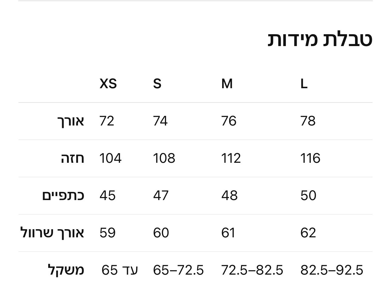 | מידה | XS, S, M, L |